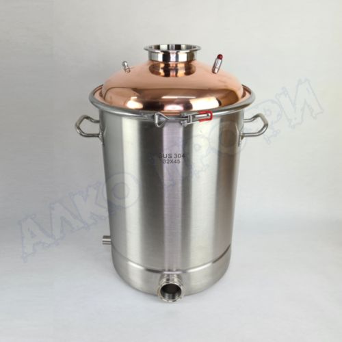 Перегонный куб из пищевой нержавеющей стали AISI 304 кастрюльного типа с крышкой из меди отечественного производства. Используется с дистилляторами (самогонными аппаратами) в качестве емкости нагрева спиртосодержащих жидкостей.